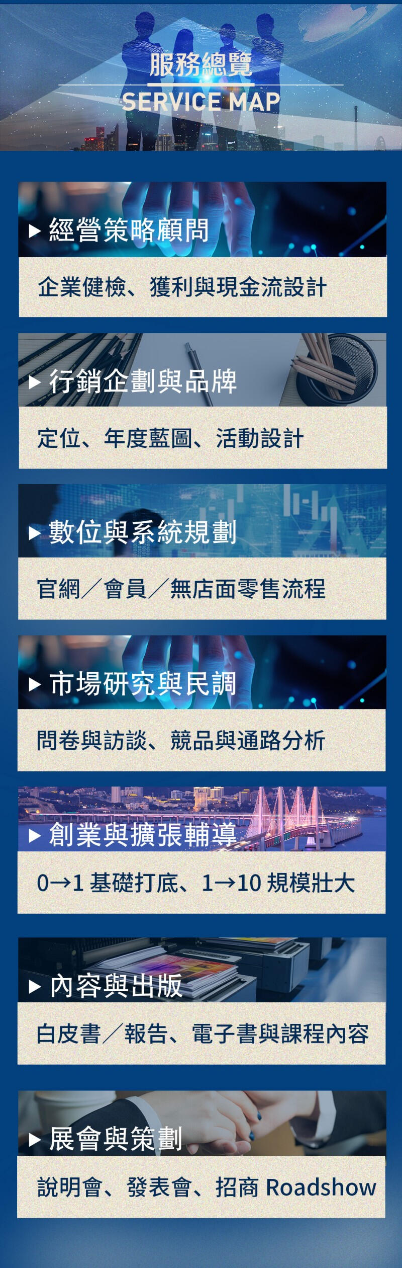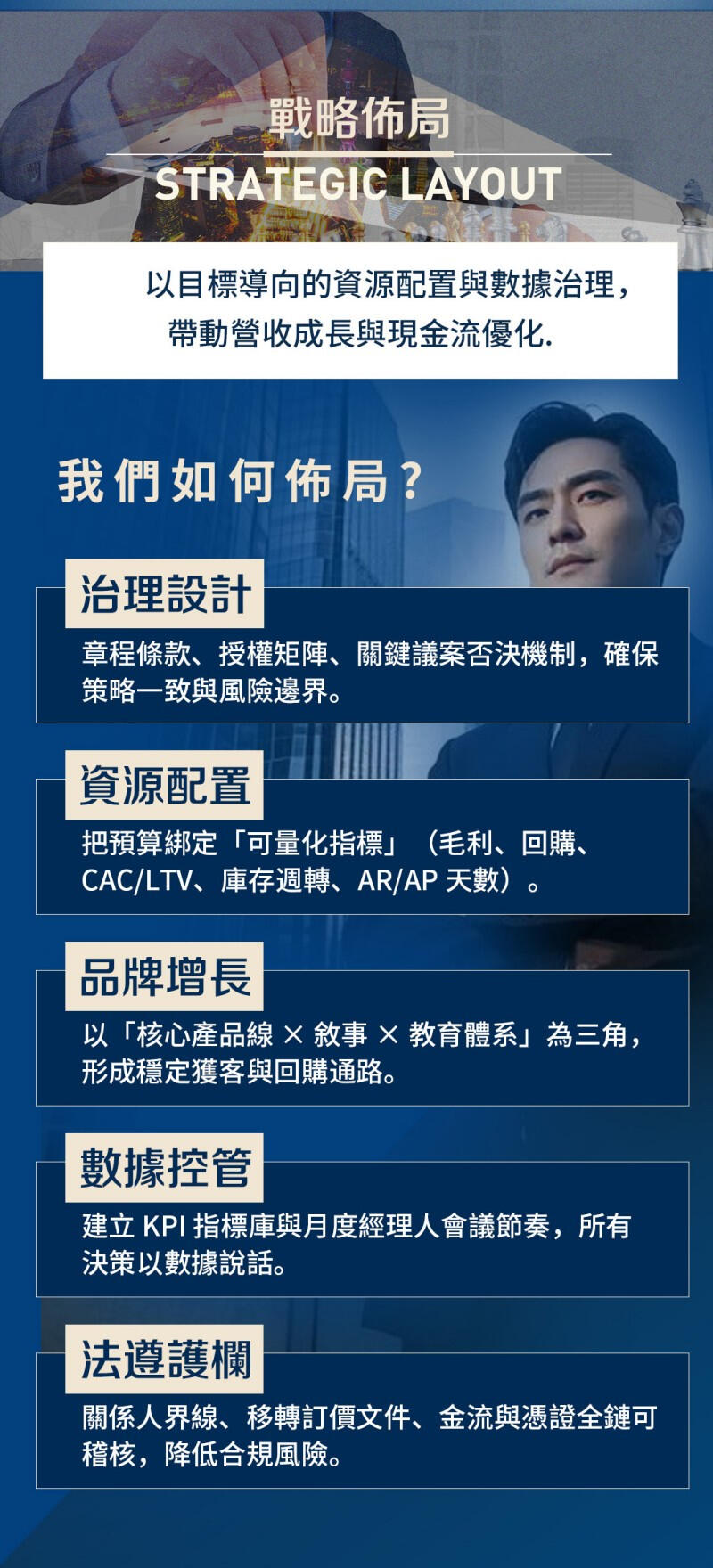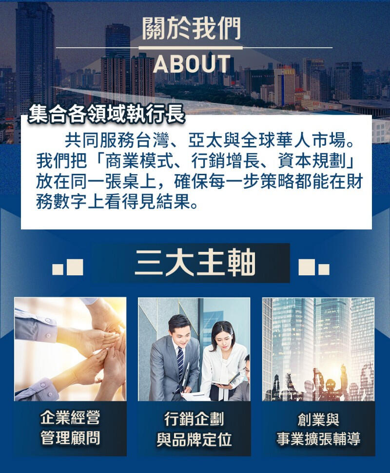 把策略、品牌與資本市場連成一條成長曲線 30+ 年跨產業實戰整合【經營策略 × 行銷系統 × 資本規劃】讓計畫落到營收與現金流,有序走向公開市場